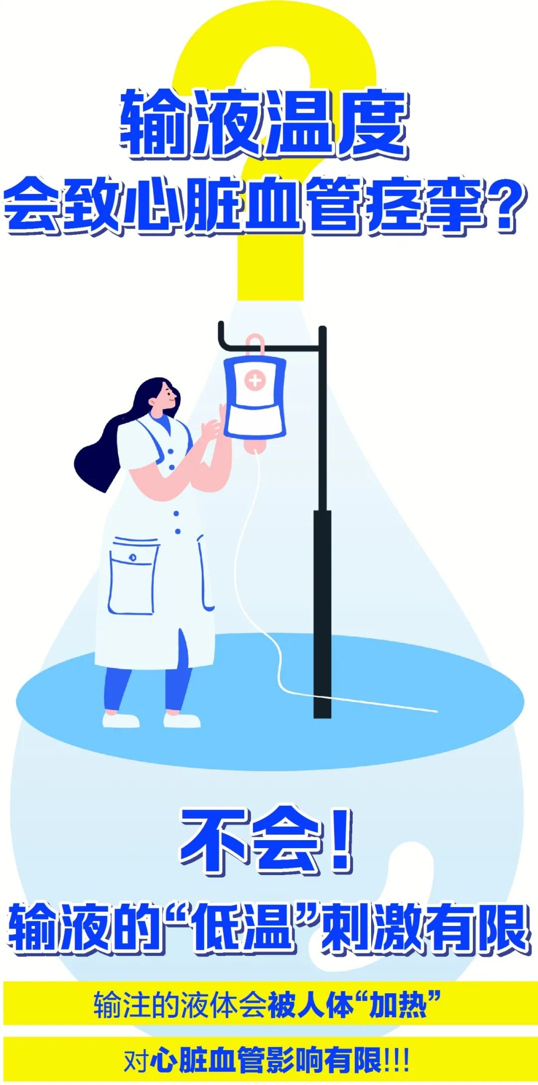 因输液温度低导致心脏血管痉挛的说法同样站不住脚。一方面,人体体温、血液的温度约为37℃,输注的液体进入心脏前,会经过人体血液和内环境的“加热”,不足以对心脏血管产生强烈刺激。