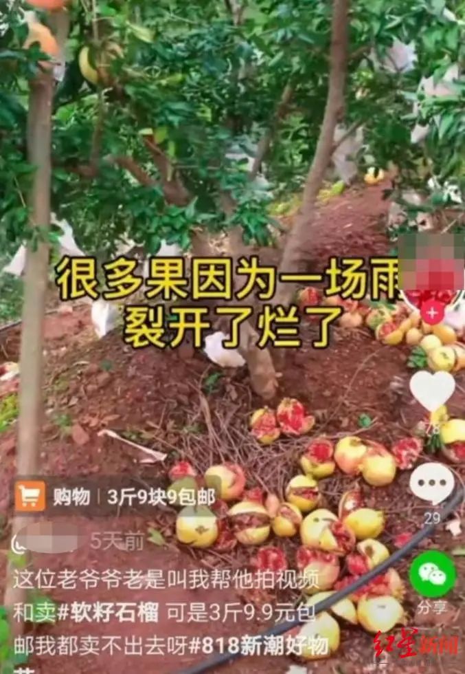 在一段短视频中,一名80多岁的老大爷头发花白,步履蹒跚地挑着两桶水,画面配文写道:“很多石榴都烂了,不如烂在地里当肥料了。”画面中,地上有一些裂开的石榴,同时配上了一段悲伤带着哭腔的声音。
