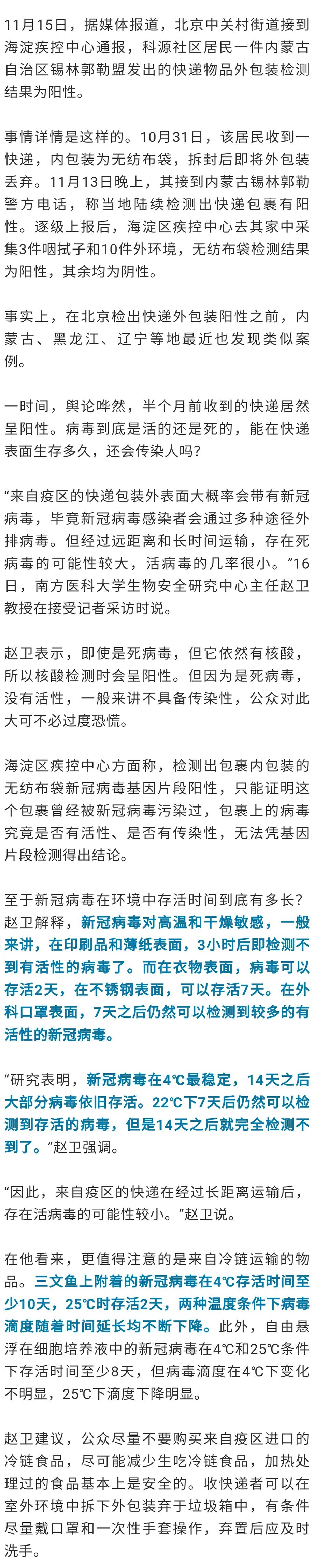 南方医科大学生物安全研究中心主任赵卫教授表示,来自疫区的快递包装外表面大概率会带有新冠病毒,毕竟新冠病毒感染者会通过多种途径外排病毒。但经过远距离和长时间运输,存在死病毒的可能性较大,活病毒的几率很小。