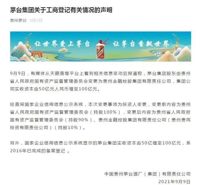 9月9日,贵州茅台微信公众号发布《茅台集团关于工商登记有关情况的声明》指出:目前,贵州省人民政府国有资产监督管理委员会(持股90%)、贵州金融控股集团有限责任公司(贵州贵民投资有限责任公司)(持股10%)。