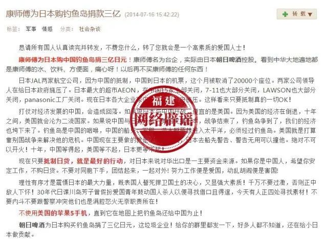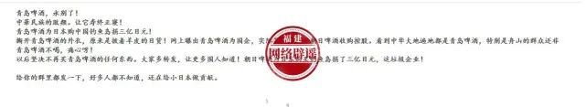 网传“被日本朝日啤酒收购”的不仅仅是贵州茅台,还有青岛啤酒、康师傅。一样的语气,同样的套路,只是换个名字,又摇身一变在网络上传播。2014年,另一品牌啤酒经销商郭某,为了“搞臭”同行产品策划“青岛啤酒被日本朝日啤酒收购控股”谣言,公安机关依法对郭某作出行政拘留3日的处罚。