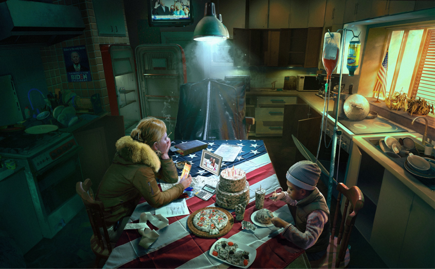 第三幅作品,是2021年9月4日创作的《nuts》。这幅画中展示“赌局”的地点在阿富汗。有两个难民儿童在和一名全副武装的士兵在玩儿牌。那孩子说,我不玩儿行不行?当然不行,看看身后一排排的士兵就知道了,弱小的国家,由不得你。赌局的裁判或者叫荷官,是一个恶魔。这场赌局庄家和玩家是一伙儿的,那公平性就不存在了。而且双方的差距非常大,士兵桌上有无数的筹码,手上还有无数的好牌,比如:生化武器、核弹、轰炸、军舰、空袭等等,还有一张“白头盔”的牌(The White Helmets)。