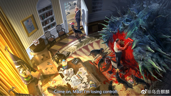 第一幅作品,是2020年创作的《白宫粉刷匠》。画面里的人物正在忙着把新冠病毒刷成红色,再贴上五角星,不遗余力地污名化中国,编造谎言,自欺欺人。