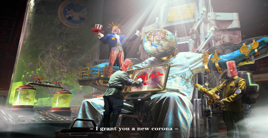 第二幅作品,是2021年7月创作的《神明改造》。画的中间,一个巨人被绑在注射病毒的设备上,这个巨人代表地球。“四大霸权”正在把地球牢牢地铐住,从右至左,分别是“舆论霸权”、“科技霸权”、“军事霸权”和“金融霸权”。