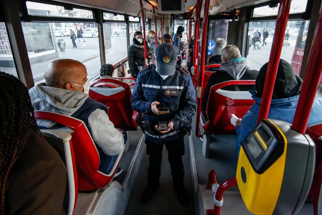 当地时间1月10日,意大利罗马,警察检查乘客绿色的通行证。/IC photo