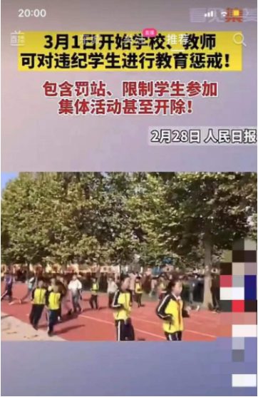 张雯的孩子去年9月刚上小学,令她印象深刻的是,家长群里曾流传过一张视频截图,上方用加粗的字体写着“2022年3月1日开始,学校、教师可对违纪学生进行教育惩戒!包含罚站、限制学生参加集体活动甚至开除!”