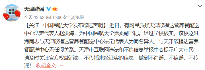 据@天津辟谣 发布消息称,近日,有网民质疑天津欣程达营养餐配送中心法定代表人赵洪海,为中国民航大学党委副书记。经过学校核实,该校赵洪海同志与天津欣程达营养餐配送中心法定代表人为同名异人,与天津欣程达营养餐配送中心无任何关系。