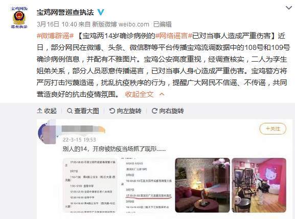 宝鸡市公安局网络安全保卫支队微博消息,近日,部分网民在微博、头条、微信群等平台传播宝鸡流调数据中的108号和109号确诊病例信息,并配有不雅图片。宝鸡公安高度重视,经调查核实,二人为孪生姐弟关系,部分人员恶意传播谣言,已对当事人身心造成严重伤害。宝鸡警方将严厉打击污蔑造谣,扰乱抗疫秩序的行为,提醒广大网民不信谣、不传谣,共同营造良好的抗击疫情氛围。