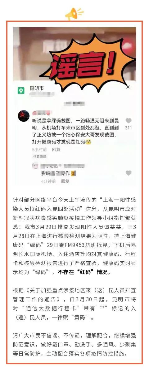 昆明市3月29日排查发现阳性人员谭某某,于3月28日在上海进行核酸检测结果为阴性,持上海健康码“绿码”29日乘FM9453航班抵昆;下机后昆明长水国际机场、入住酒店等均对其健康码、行程卡和核酸检测报告进行了严格查验,健康码实时显示均为“绿码”,不存在“红码”情况。