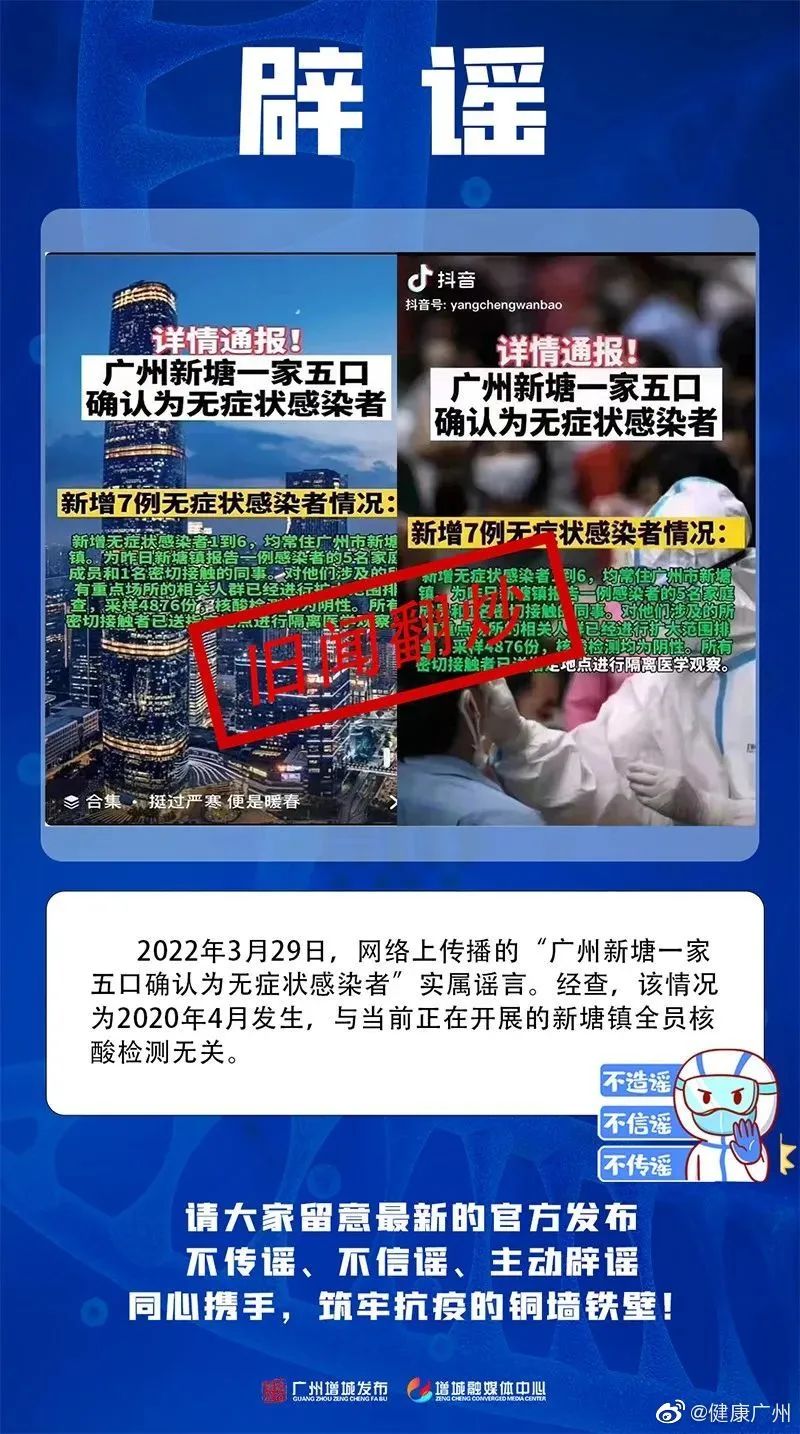 3月29日,网络上传播“广州新塘一家五口确认为无症状感染者”。增城区相关部门表示,该说法属谣言!