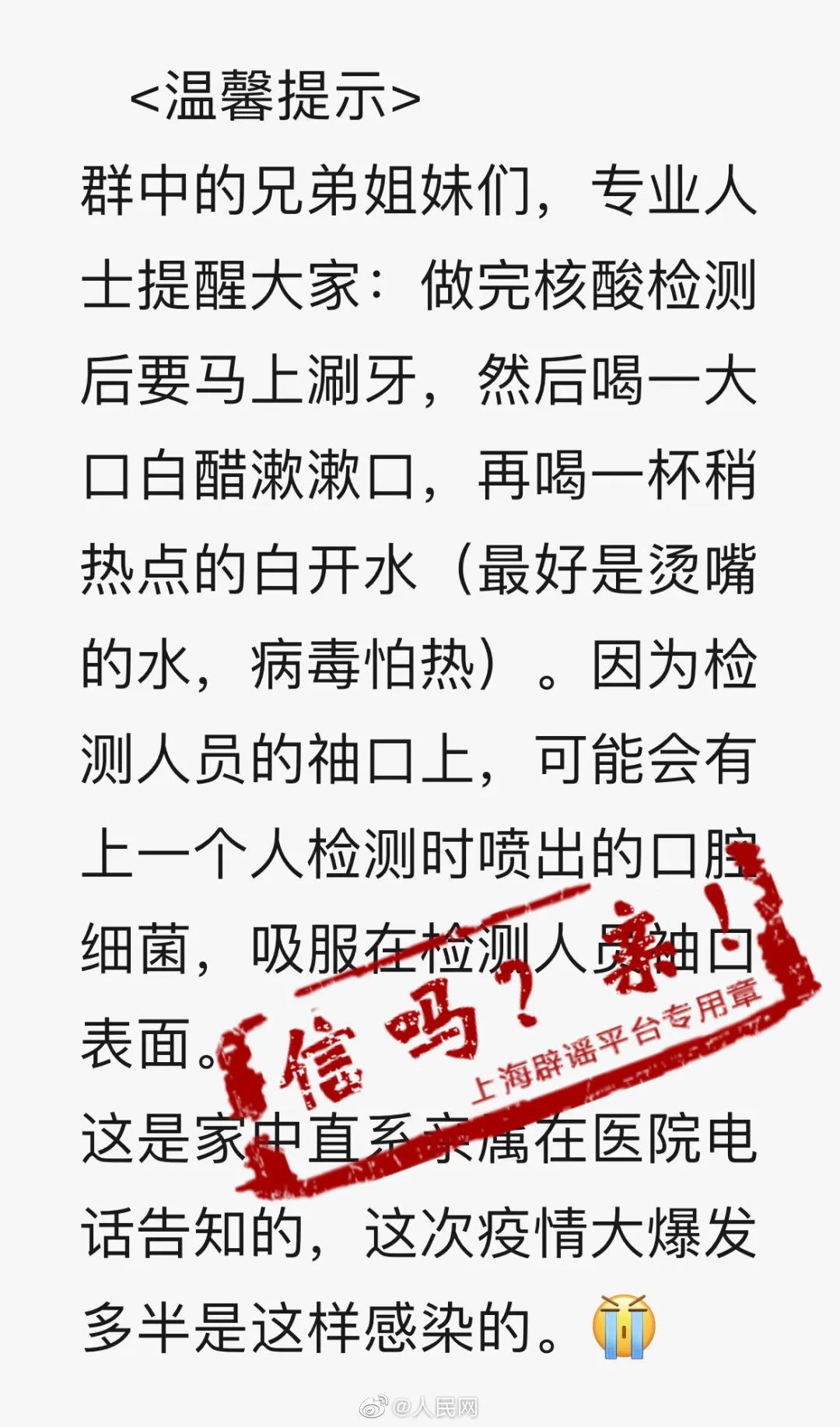 近日,一条“温馨提醒”声称,做完核酸要喝醋和热水杀菌。