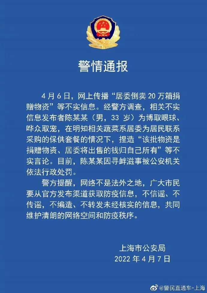 上海市公安局7日凌晨通报,4月6日,有人在网上传播“居委倒卖20万箱捐赠物资”等不实信息。
