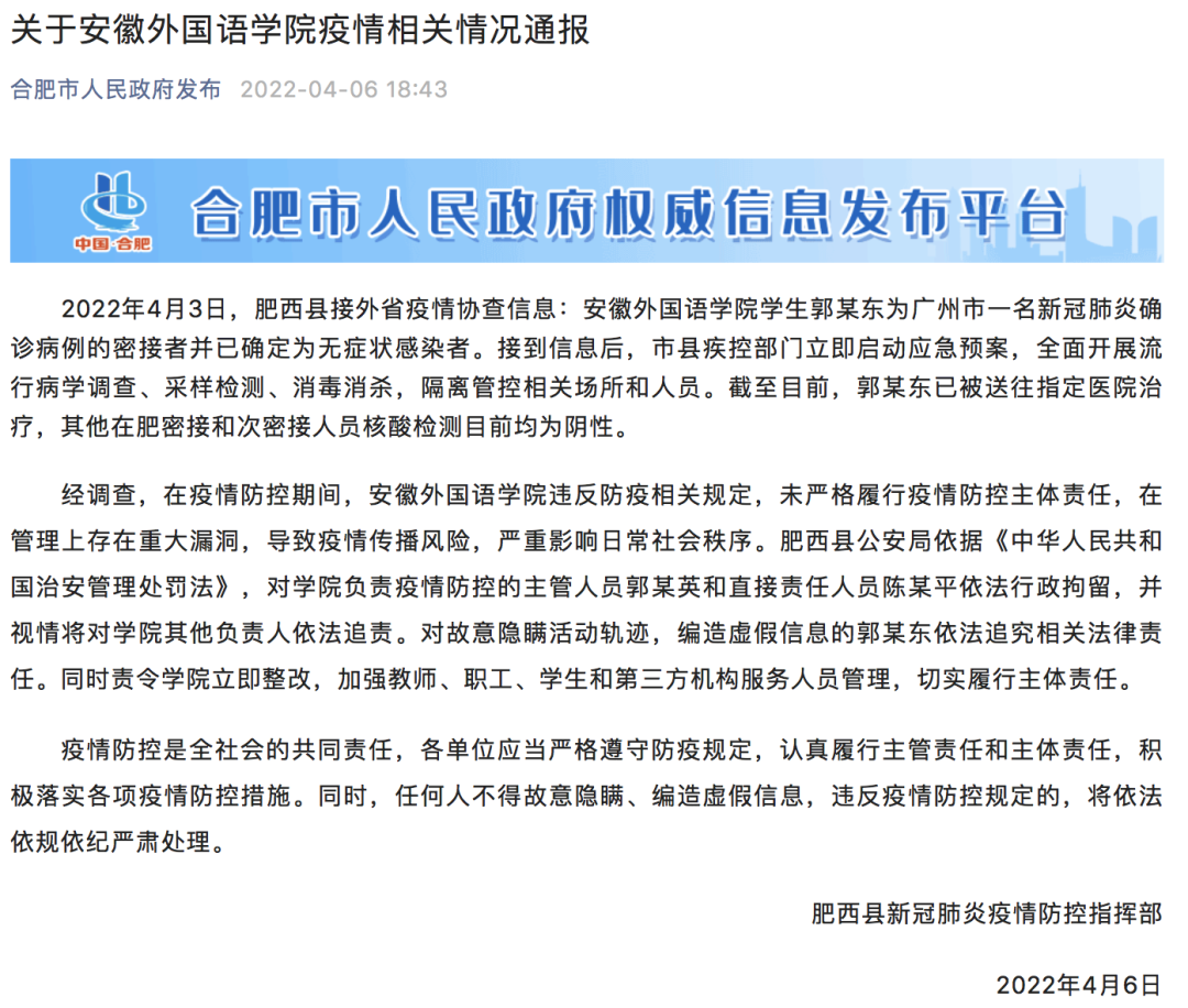 其中称,经调查,在疫情防控期间,安徽外国语学院违反防疫相关规定,未严格履行疫情防控主体责任,在管理上存在重大漏洞,导致疫情传播风险,严重影响日常社会秩序。
