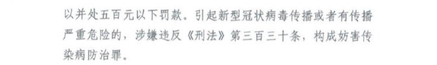 3月10日,合肥市司法局曾发布《违反疫情防控管理秩序的行为及法律后果明白纸》:隐瞒病情、未按照规定报备行程信息、隐瞒与确诊病例或者疑似病例有密切接触史的,涉嫌违反《治安管理处罚法》第五十条,处警告或者二百元以下罚款;情节严重的,处五日以上十日以下拘留,可以并处五百元以下罚款。引起新型冠状病毒传播或者有传播严重危险的,涉嫌违反《刑法》第三百三十条,构成妨害传染病防治罪。