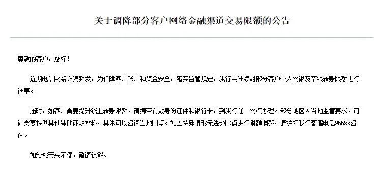 农业银行关于调降部分客户网络金融渠道交易限额的公告。
