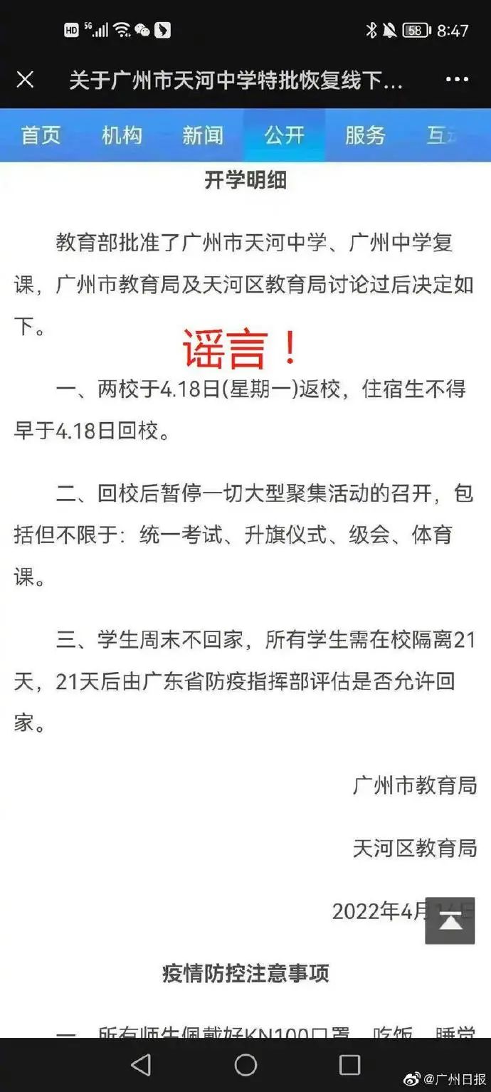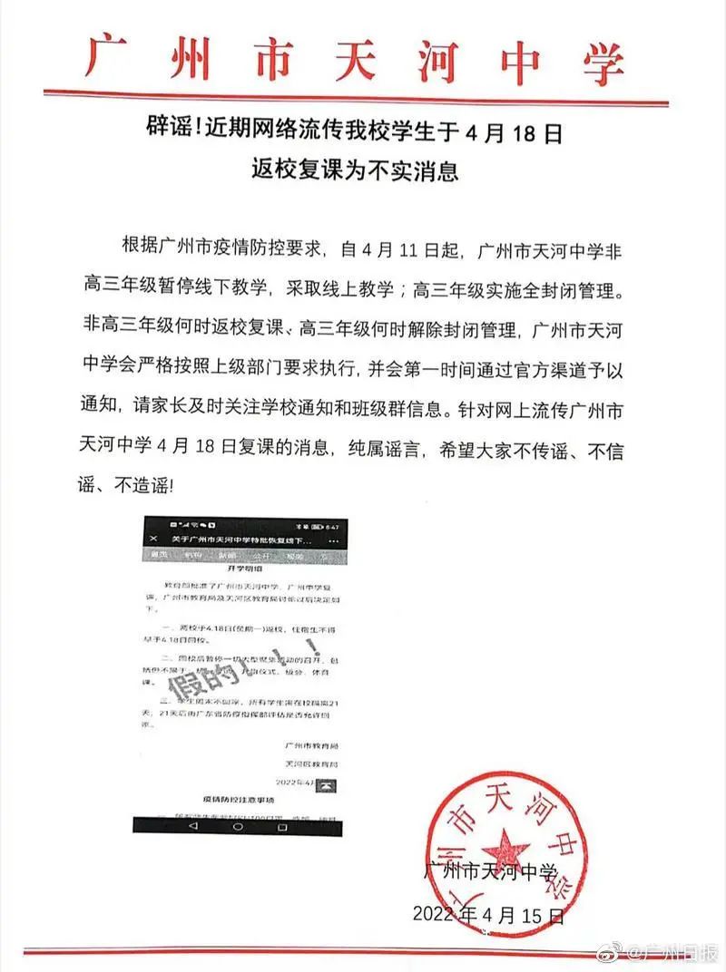 据@广州日报 消息,近日,家长群中流传一张截图,截图称广州市天河中学、广州中学将于4月18日返校复课。记者向天河区教育局相关负责人求证得知,该截图信息不属实。4月15日,广州市天河中学、广州中学也分别发布通告,对上述不实消息进行了辟谣。