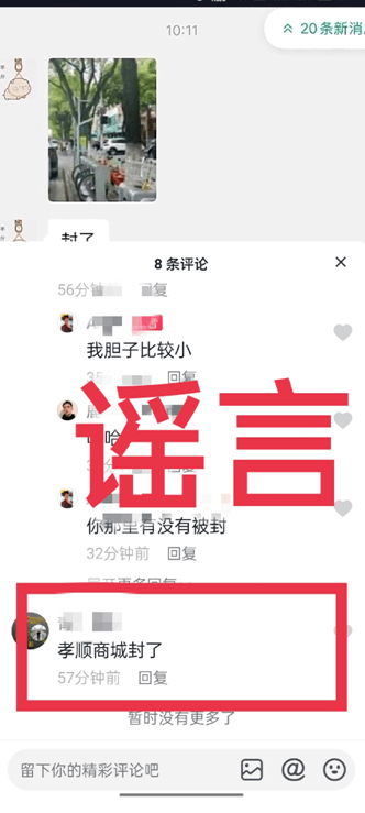 4月15日,有网民在“抖音”平台评论区发布信息称“孝顺商城封了”。经核实,上述为不实信息。孝顺商城当前没有采取封控措施,顾客在查验体温、“健康码”和“行程码”均正常后可以出入。