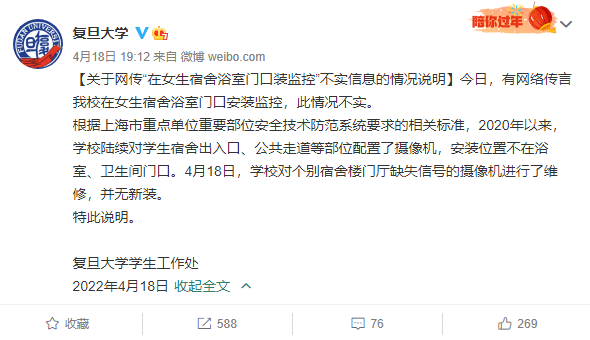 关于网传“在女生宿舍浴室门口装监控”不实信息的情况说明