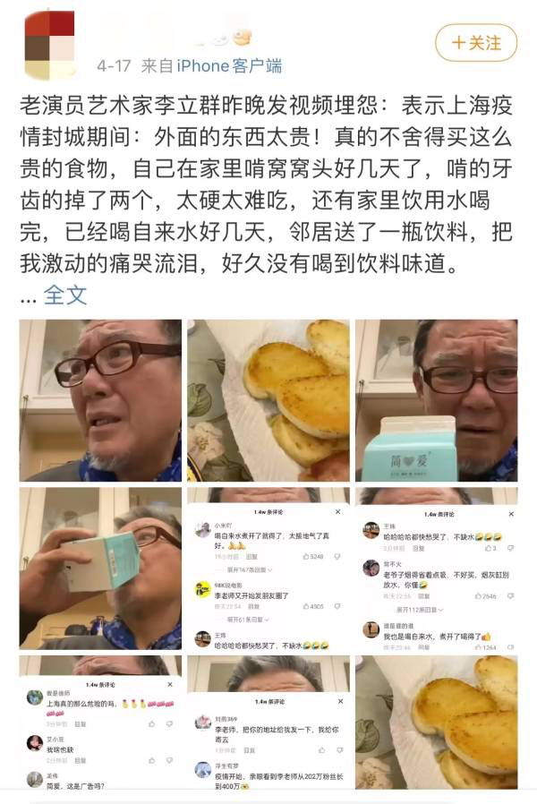 两段视频点赞近70万的同时,却有一些自媒体博主发帖称,李立群抱怨居家生活:“饮用水喝完,已经喝自来水好几天,邻居送了一瓶饮料,把我激动得痛哭流泪,好久没有喝到饮料味道。”
