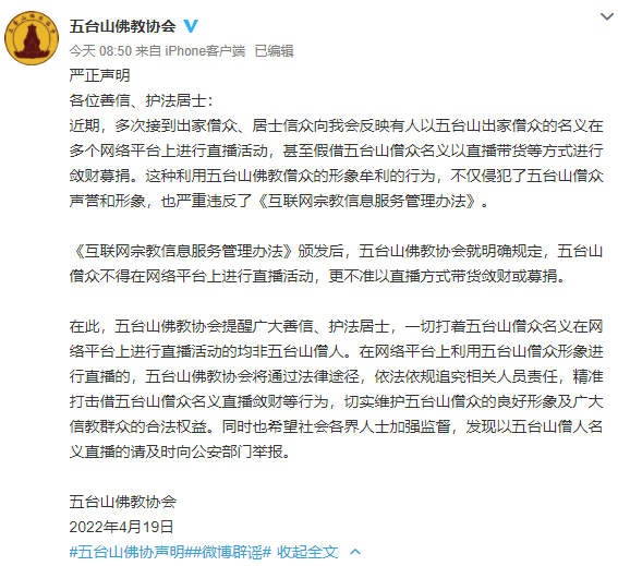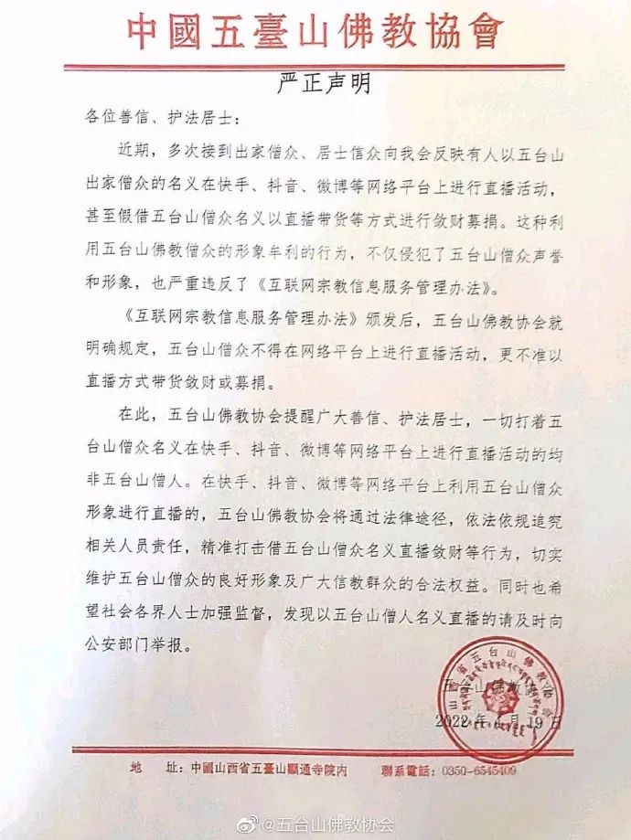 五台山僧人直播带货?五台山佛协严正声明!