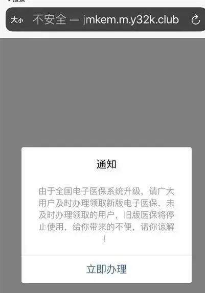4月13日,郑先生收到了一条这样的短信。他按照提示,点击短信里的链接,立即弹出一条通知。通知内容为“由于全国电子医保系统升级,请广大用户及时办理领取新版电子医保,未及时办理领取的用户,旧版医保将停止使用,给你带来的不便,请你谅解!立即办理”。