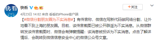 据新华社快看官方微博消息,有传言称,微信在写新代码做网络分割,让外地看不到上海的朋友圈。目前,该传言截图已被公开辟谣为不实消息。从微信群转发该传言截图时,微信会有弹窗提醒:该消息被投诉为不实消息。点击了解详情后,会跳转到微信信息安全中心的微信公众号文章。