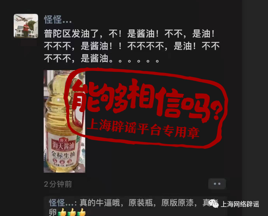 近日,网传普陀区发放食用油物资时,用的是带有“酱油”“生抽”字样的瓶身。