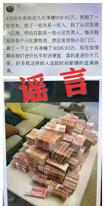 4月23日,“警民直通车上海”发布警情通告:近日,一篇所谓“个人利用疫情高价倒卖物资,一个月获利上千万”的帖子在网络流传。经警方调查,信某(男,32岁)疫情期间封控在家,为博取眼球、吸引关注,于2022年4月10日在网上虚构了自己“在疫情期间租用货车,高价倒卖物资,仅九天净赚人民币908.82万元,3月份赚了人民币3006.93万元”等不实言论,并配了一张从网上下载的桌上堆满人民币的照片,引起网民大量关注,产生不良社会影响。
