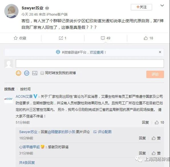 上海辟谣平台注意到,该公司的官方微博“ACON艾康”在微博评论区回复了网传说法:关于“厂家检测出阳性”言论为不实消息,艾康生物所有员工都严格遵守国家及公司防疫要求,定期核酸检测,并没有人员核酸检测结果阳性人员。且我司工厂所在位置不在目前已划定的杭州三区管控范围内。另外,我司今日刚刚完成浙江省药监局新冠抗原产品的现场抽查。请大家不信谣不传谣!