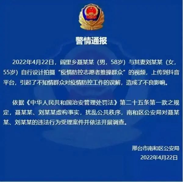 当天下午,邢台市南和区公安局发布“警情通报”称:2022年4月22日,阎里乡聂某某(男,58岁)与其妻刘某某(女,55岁)自行设计拍摄“疫情防控志愿者推搡群众”的视频,上传到抖音平台,引起了不知情群众对疫情防控工作的误解,造成了不良影响。