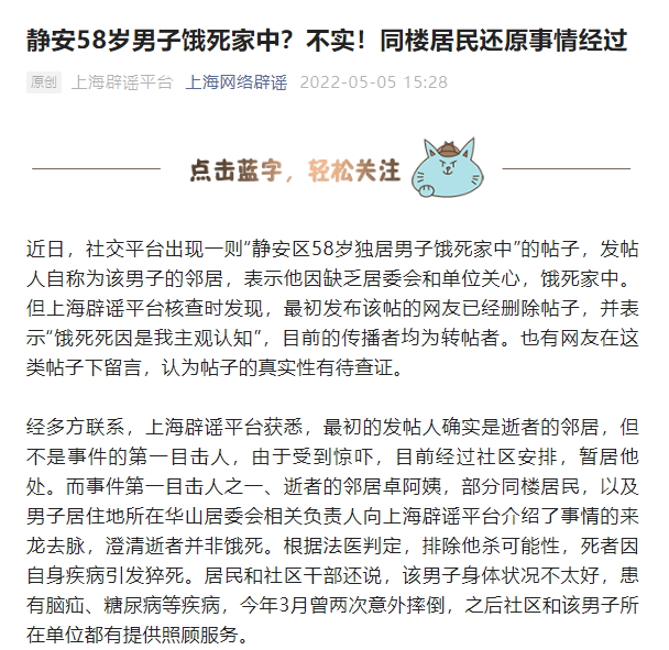 近日,社交平台出现一则“静安区58岁独居男子饿死家中”的帖子,发帖人自称为该男子的邻居,表示他因缺乏居委会和单位关心,饿死家中。但上海辟谣平台核查时发现,最初发布该帖的网友已经删除帖子,并表示“饿死死因是我主观认知”,目前的传播者均为转帖者。也有网友在这类帖子下留言,认为帖子的真实性有待查证。