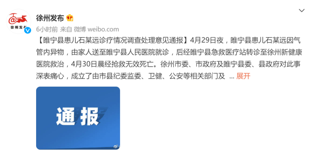 4月29日夜,睢宁县患儿石某远因气管内异物,由家人送至睢宁县人民医院就诊,后经睢宁县急救医疗站转诊至徐州新健康医院救治,4月30日晨经抢救无效死亡。徐州市委、市政府及睢宁县委、县政府对此事深表痛心,成立了由市县纪委监委、卫健、公安等相关部门及医疗专家组成的联合调查组,对患儿诊疗情况开展深入调查。