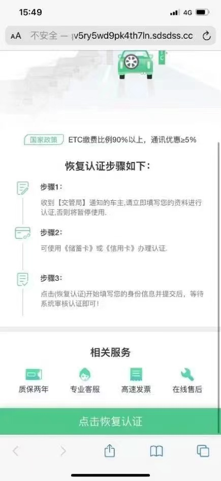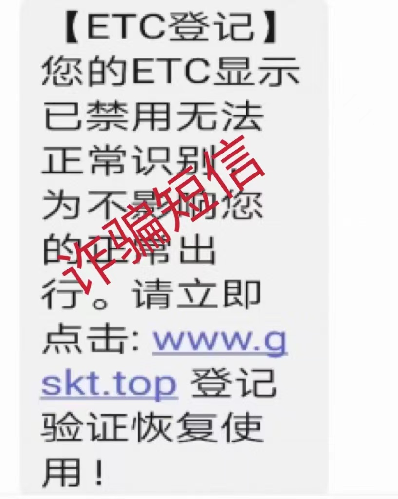 自ETC普及以来,各式各样的诈骗短信层出不穷,不法分子冒充“ETC中心”、“高速管理中心”、“交管局”等机构,通过发送短信“ETC过期认证、系统升级、失效激活”等内容,并附带业务办理的网页链接,诱骗用户点击链接。