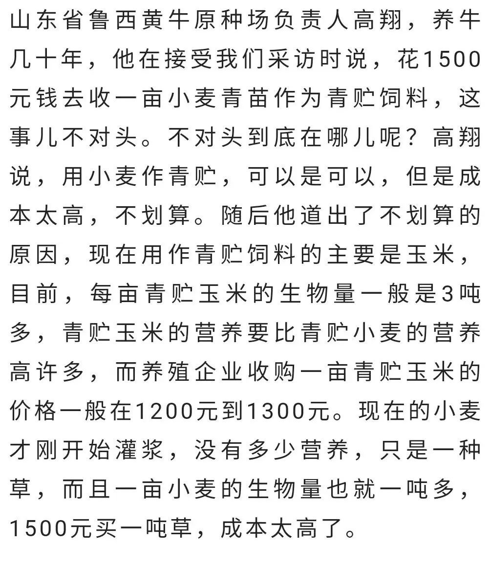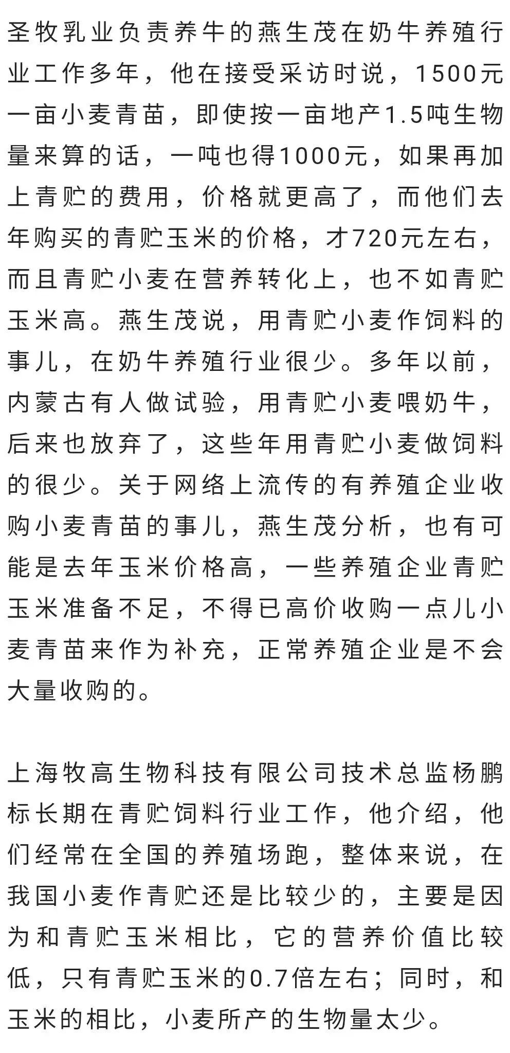 中国农业科学院畜牧研究所高级畜牧师赵连生在采访中也认为,用1500元一亩收购小麦青苗作青贮,对于养殖企业来说是不划算的。