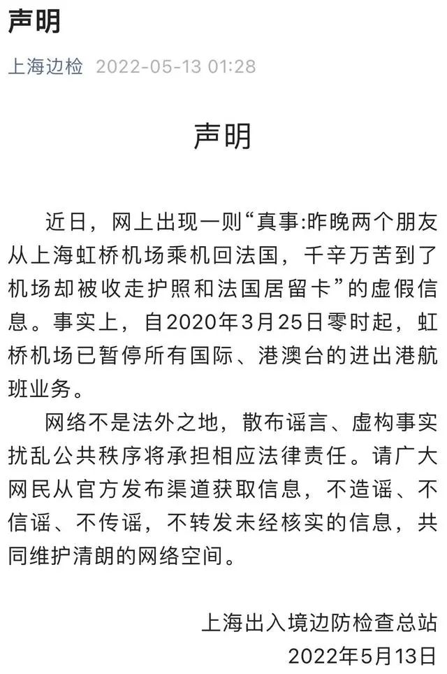 上海边检总站在声明中称,近日,网上出现一则“真事:昨晚两个朋友从上海虹桥机场乘机回法国,千辛万苦到了机场却被收走护照和法国居留卡”的虚假信息。事实上,自2020年3月25日零时起,虹桥机场已暂停所有国际、港澳台的进出港航班业务。