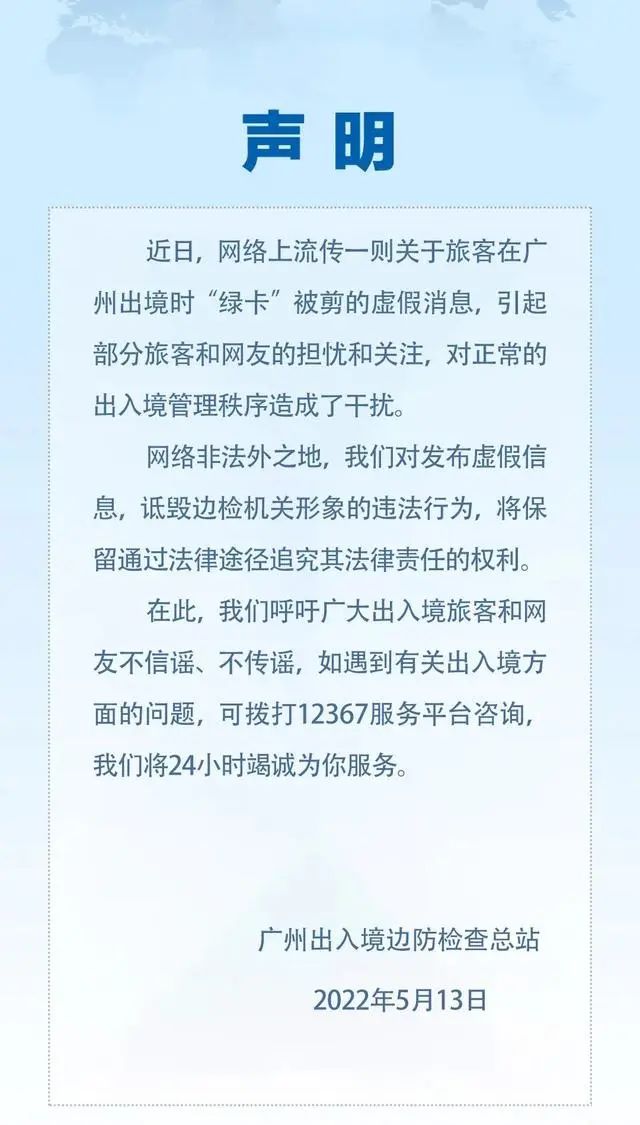 广州边检总站则表示,近日,网络上流传一则关于旅客在广州出境时“绿卡”被剪的虛假消息,引起部分旅客和网友的担忧和关注,对正常的出入境管理秩序造成了干扰。声明称:“网络非法外之地,我们对发布虚假信息,诋毁边检机关形象的违法行为,将保留通过法律途径追究其法律责任的权利。”