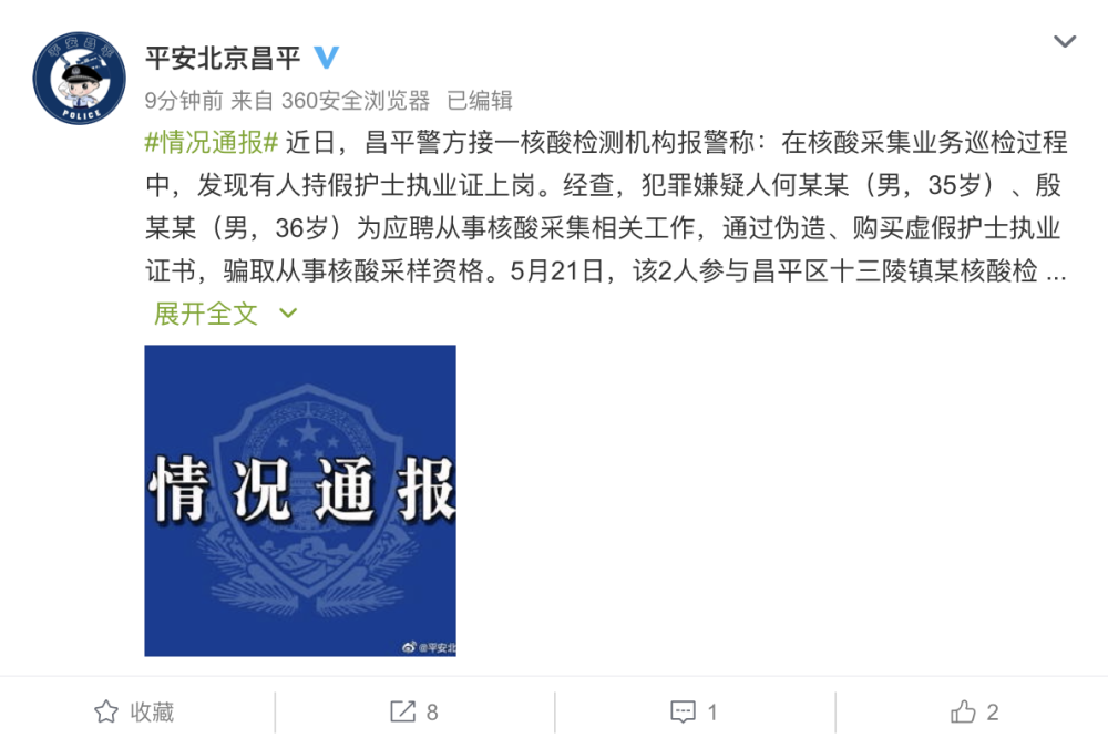 5月22日,据北京市公安局昌平分局官方微博@平安北京昌平 消息,近日,北京昌平警方接一核酸检测机构报警称:在核酸采集业务巡检过程中,发现有人持假护士执业证上岗。