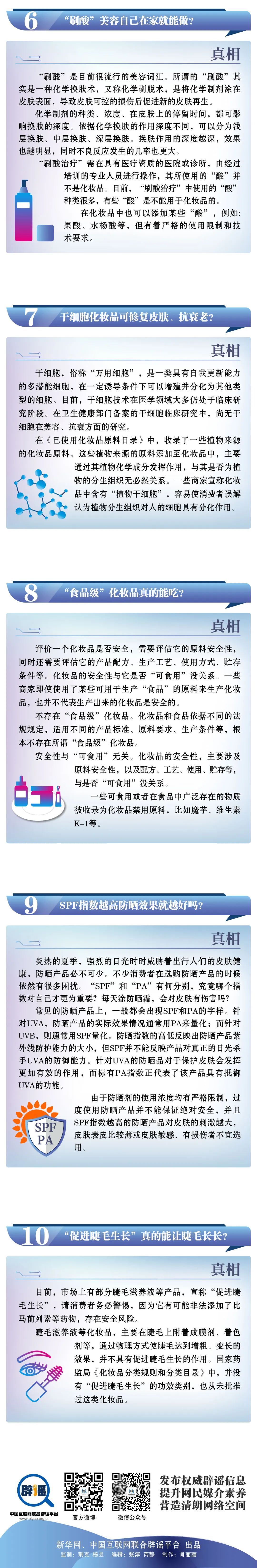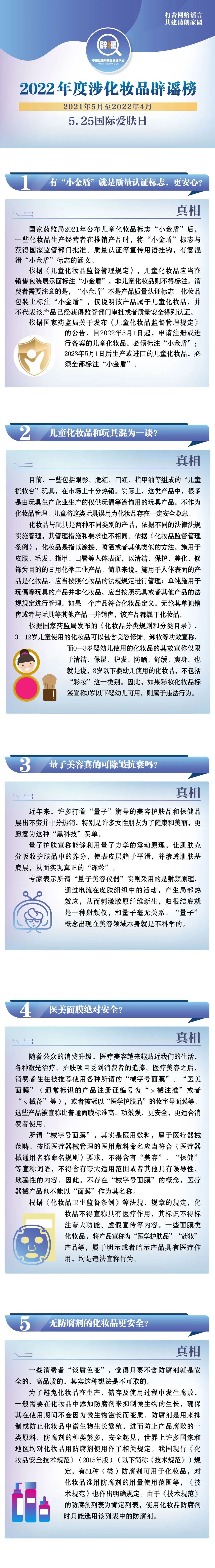5月25日,在“国际爱肤日”到来之际,为更好地普及化妆品购买、使用等安全知识,引导消费者增强科学安全用妆意识,新华网、中国互联网联合辟谣平台共同发布“2022年度涉化妆品辟谣榜”。