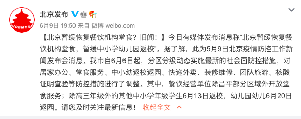 6月9日,有媒体发布消息称“北京暂缓恢复餐饮机构堂食,暂缓中小学幼儿园返校”。据了解,此为5月9日北京疫情防控工作新闻发布会消息。
