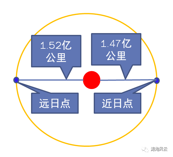 近日点和远日点之间的距离差异只有大约三百万英里,只是日地之间的平均距离9300万英里的一小部分,微不足道。大约如下图:
