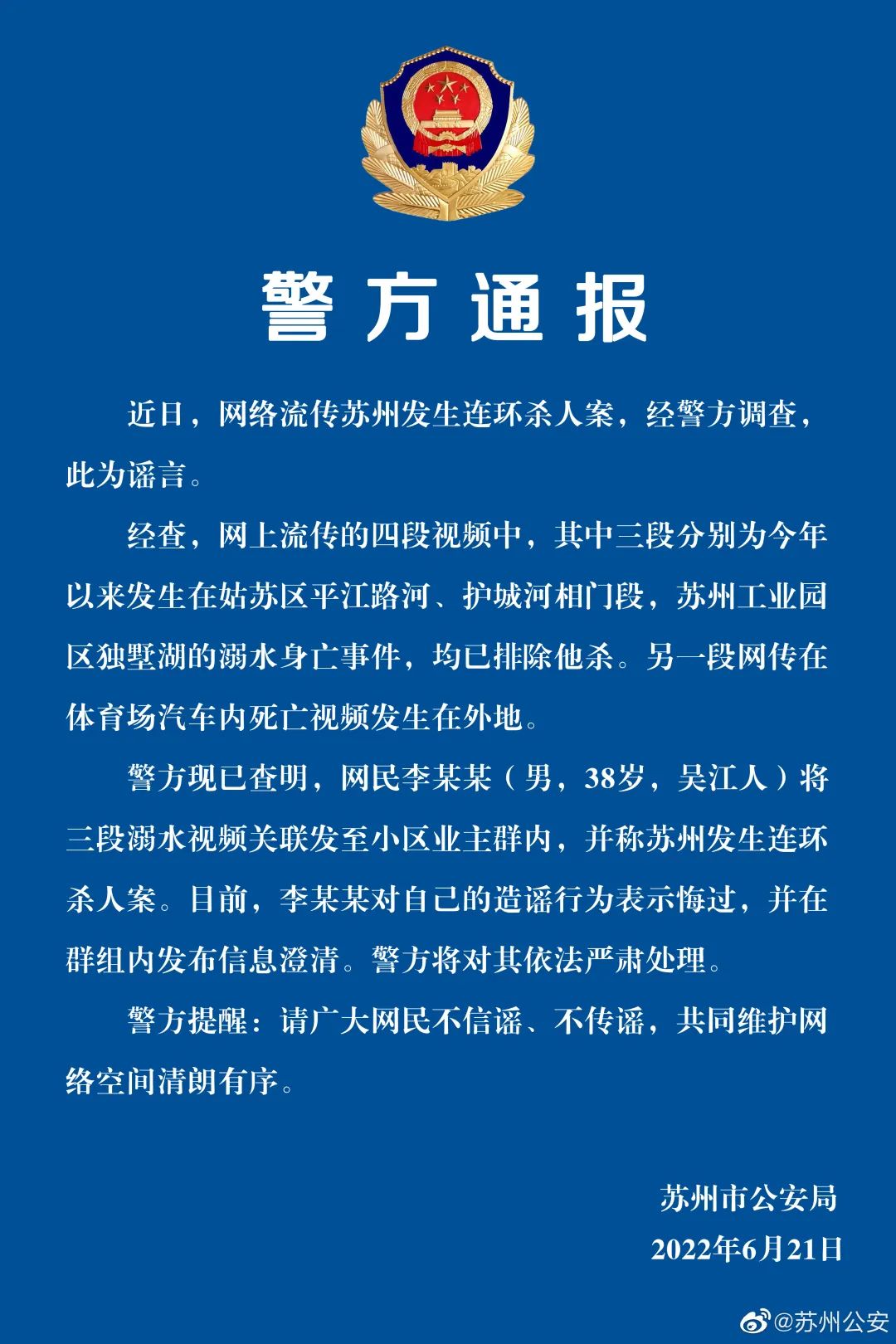 警方现已查明,网民李某某(男,38岁,吴江人)将三段溺水视频关联发至小区业主群内,并称苏州发生连环杀人案。目前,李某某对自己的造谣行为表示悔过,并在群组内发布信息澄清。警方将对其依法严肃处理。