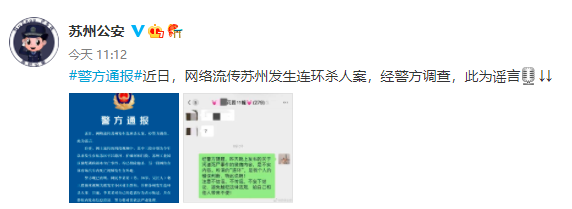 近日,网络流传苏州发生连环杀人案,经警方调查,此为谣言。
