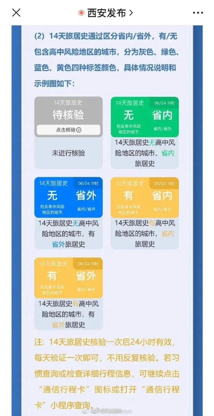 经核实,“西安发布”微信公众号6月29日发布了陕西一码通新变化,表示将用旅居史标签的颜色进行分类。7月1日,记者致电陕西12345服务热线,工作人员表示,目前该标签暂时对出行无影响,还是按照统一的疫情防控政策执行,目前北京低风险地区进西安提供48小时核酸及完成3天两检即可。当天,记者发现“西安发布”微信公众号已经删除了此前推送的“陕西一码通”变化的相关文章。