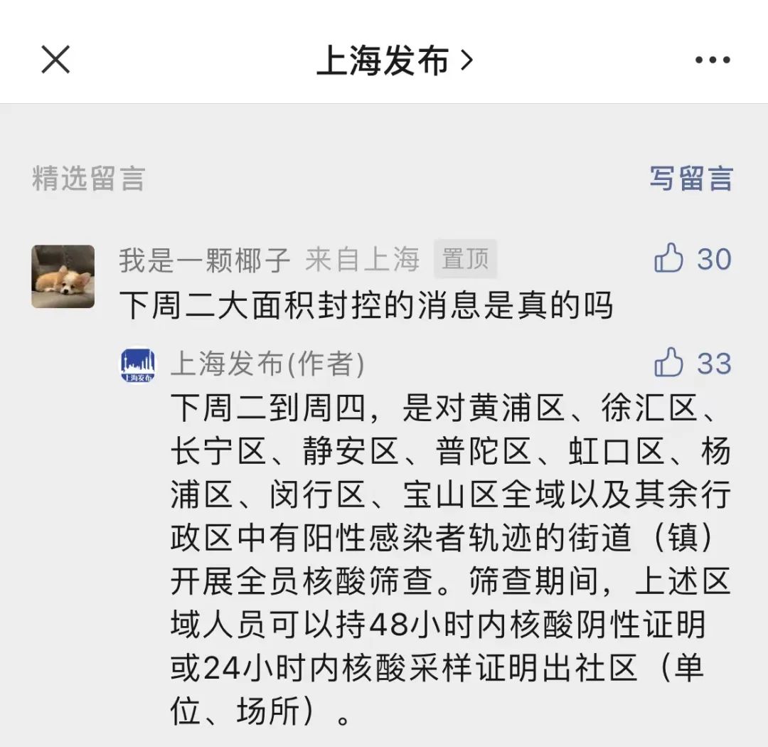 10日傍晚,有网友在上海发布微信公众号评论区留言:下周二大面积封控的消息是真的吗?