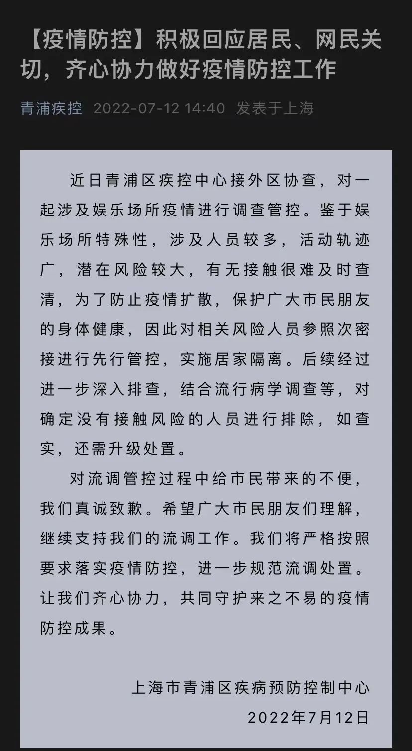 近日青浦区疾控中心接外区协查,对一起涉及娱乐场所疫情进行调查管控。鉴于娱乐场所特殊性,涉及人员较多,活动轨迹广,潜在风险较大,有无接触很难及时查清,为了防止疫情扩散,保护广大市民朋友的身体健康,因此对相关风险人员参照次密接进行先行管控,实施居家隔离。后续经过进一步深入排查,结合流行病学调查等,对确定没有接触风险的人员进行排除,如查实,还需升级处置。