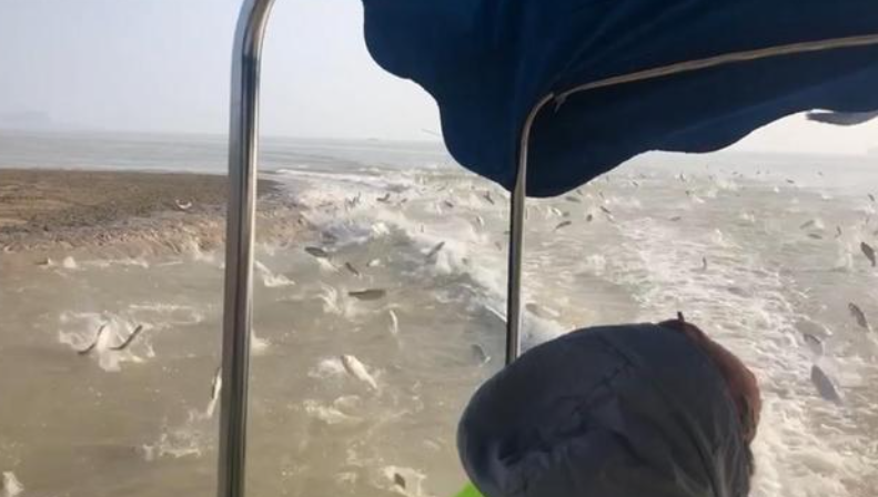 “从视频看,鱼群跃起的水域比较狭窄, 而在空间狭窄密度过大的情况下, 整个鱼群受到惊吓,就会发生集体跃起的现象。”