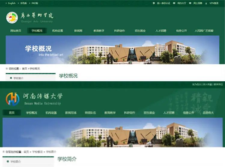 另外,“河南传媒大学”网站内容大量盗用广西艺术学院网站信息,从界面形式到具体内容,均与广西艺术学院官网高度相似。
