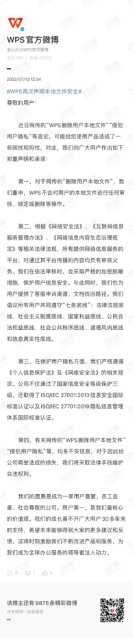 7月13日,WPS再次发布对外声明,表示对因近日网络不实言论对WPS用户造成的困扰和担忧表示关切,并重申和承诺“WPS不会对用户的本地文件进行任何审核、锁定或删除等操作”。WPS方面明确澄清“有关网传的“WPS删除用户本地文件““侵犯用户隐私”系不实信息,WPS在依法审核时,会采取严格的加密脱敏措施,保护用户信息安全,并为用户提供客服申诉渠道、文档找回路径。