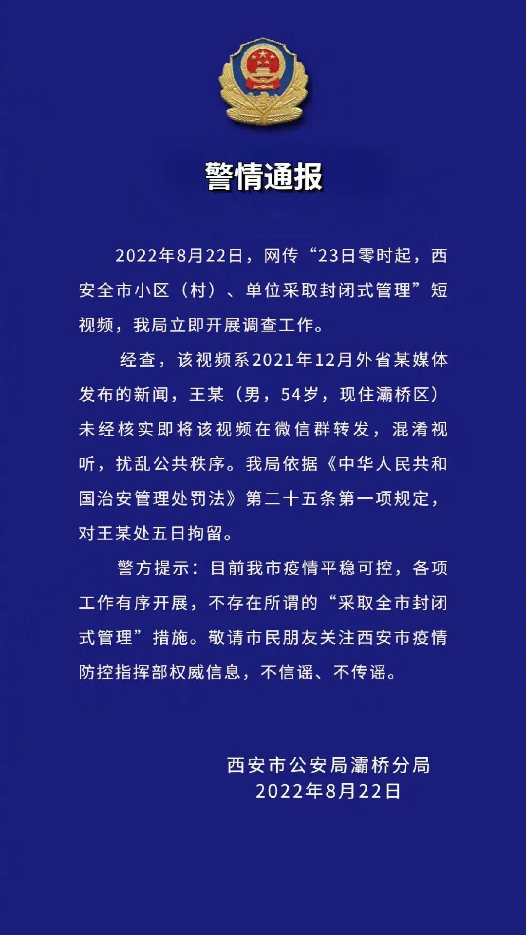 据@西安公安 22日晚发布警情通报称,经查,该视频系2021年12月外省某媒体发布的新闻,王某(男,54岁,现住灞桥区)未经核实即将该视频在微信群转发,混淆视听,扰乱公共秩序。西安市公安局灞桥分局依据《中华人民共和国治安管理处罚法》第二十五条第一项规定,对王某处五日拘留。