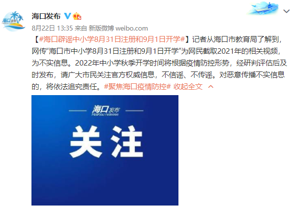 记者从海口市教育局了解到,网传“海口市中小学8月31日注册和9月1日开学”为网民截取2021年的相关视频,为不实信息。2022年中小学秋季开学时间将根据疫情防控形势,经研判评估后及时发布,请广大市民关注官方权威信息,不信谣、不传谣。对恶意传播不实信息的,将依法追究责任。